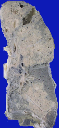 肉眼:肺表面和切面可见灰黄或灰白色粟粒大小结节。