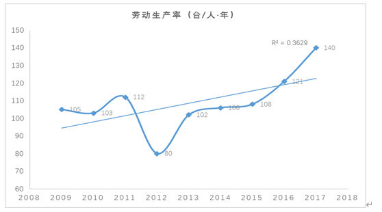 东风日产广州基地聚集了研发、采购、企业、生产制造、营销、服务等在内的全价值链体系。在整车生产领域,广州基地拥有被誉为“世界级母工厂”的花都工厂。其中花都工厂由一工厂和二工厂组成,整体占地面积247.5万平方米,年整车规划生产能力55万辆。花都工厂拥有的冲压、焊装、涂装、树脂、总装等五大工艺均达日产全球标杆工艺水平,采用柔性化生产机制,是东风日产规模化车型基地花都工厂平均57秒即可生产、组装一辆世界级品质的汽车,刷新了全球生产节拍记录。从2003年正式成立到2017年,东风日产快速发展,年销售量从6.5万辆增长到111万辆,行业排名从成立初的第十名前进至目前的前五,累计销量达900万辆。在雷诺日产全球联盟工厂综合竞争力排名中,花都二工厂和一工厂,更是多次包揽冠亚军,成为当之无愧的全球标杆。2018年,花都工厂计划生产整车675181量,为此,公司人事部需要估计2018年所需员工总量。从统计结果来看,花都工厂2009年到2017年劳动生产率平均为108台/(人·年),具体变动趋势如下图所示。