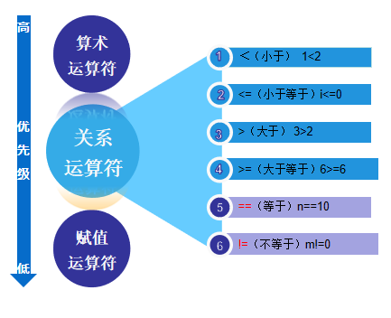 关系运算符:在C语言中,进行比较大小的运算,并产生运算结果1(真)或0(假)称为关系运算符。