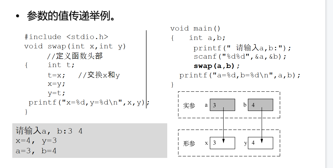 (1)在swap()函数中,虽然形参x和y交换了,但是返回main()后,实参a和b的值没有改变。