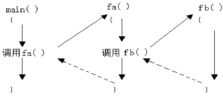 首先从main()函数开始执行程序,当遇到调用fa函数的语句时, 跳到函数fa去执行;在执行函数fa的过程中,当遇到调用fb函数的语句时,跳到函数fb去执行;在执行函数fb的过程中,当遇到return语句或该函数的最外层“}”时,返回函数fa,从调用fb函数语句的下一条语句继续执行fa;在函数fa中,当遇到return语句或该函数的外层“}”时,返回到main函数,从调用fa函数语句的下一条语句继续执行;最后,遇到main函数的外层“}”时,程序运行结束。