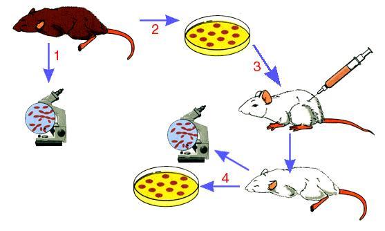 科赫法则:判定某种微生物引起特定疾病,必须同时满足;相关性:这种微生物必须在所有患该种疾病的生内都存在,但在健康生物中不存在;可分离培养:必须将这种微生物分离出来,作纯种培养;可人工感染:当用这种分离出来的微生物接种到一个健康寄主时,必须能够引起同样的疾病;可再分离:必须能够从接种感染的生物体内再次分离得到这种微生物。