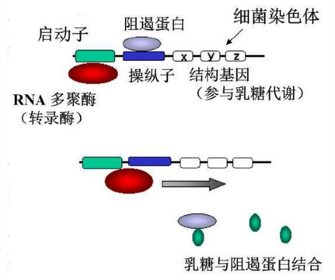 没有乳糖时,阻遏蛋白结合基因上游的操纵子,阻止转录合成与利用乳糖有关的蛋白质。有乳糖时,乳糖与阻遏蛋白结合,解除对操纵子的结合,开始转录和合成与利用乳糖有关的蛋白质。