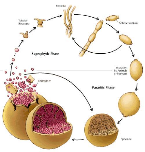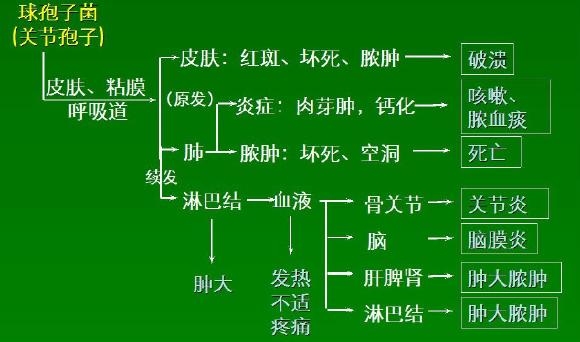 由粗球孢子菌引起,双相生活史,两种类型孢子:关节孢子、球孢子。又称山谷热、沙漠热、球孢子菌肉芽肿,主要流行于美洲山谷和沙漠地区,通过呼吸道感染,慢性、散播性疾病,发生化脓性肉芽肿,侵袭皮肤、内脏、骨髓,可致死。