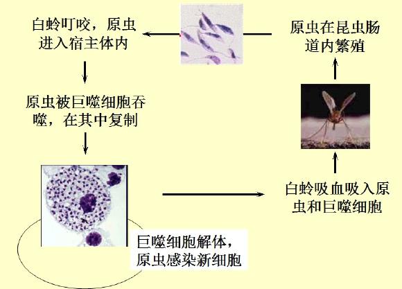 由利什曼鞭毛虫引起,经白蛉叮咬传播;进入体内后,被巨噬细胞吞噬,在其中寄生、繁殖。 经血液到达全身,引起从体表到全身脏器各种严重疾病。