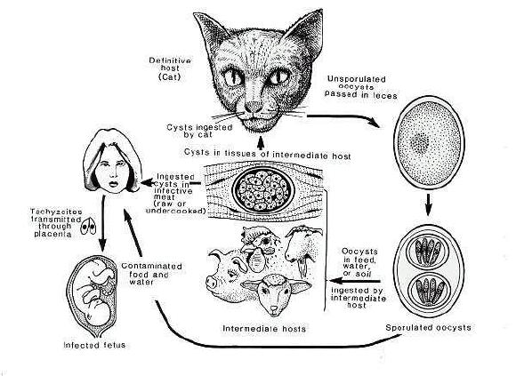 弓形虫:一种孢子虫, 可通过食物感染,或通过体表皮肤粘膜感染, 对孕妇和胎儿危害最大。