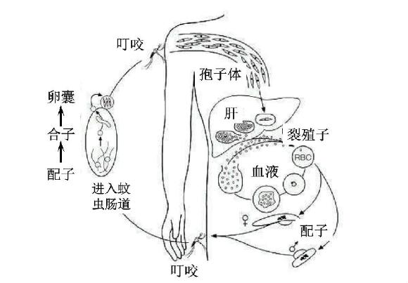 蚊子叮咬,疟原虫孢子体进入人体;在肝细胞中形成数以万计的裂殖子,也可在肝脏中潜伏;裂殖子进入血液,在红细胞中繁殖,造成细胞破裂。血液中疟原虫数量可达2 百万/毫升;部分疟原虫在血液中形成配子体;配子体由蚊子叮咬进入蚊虫肠道,结合受精,形成动合子;动合子穿过蚊虫肠壁,分裂形成大量孢子体;孢子体移动到蚊子唾液腺,经叮咬进入个人体。