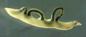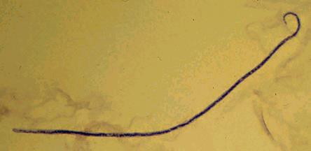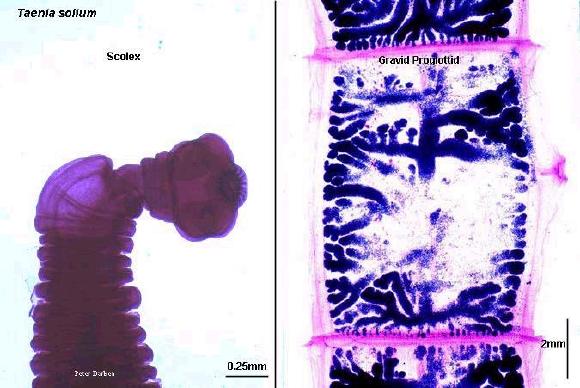 猪带绦虫:由无数功能相对独立的节片和头节构成, 成虫可长达6-8米。