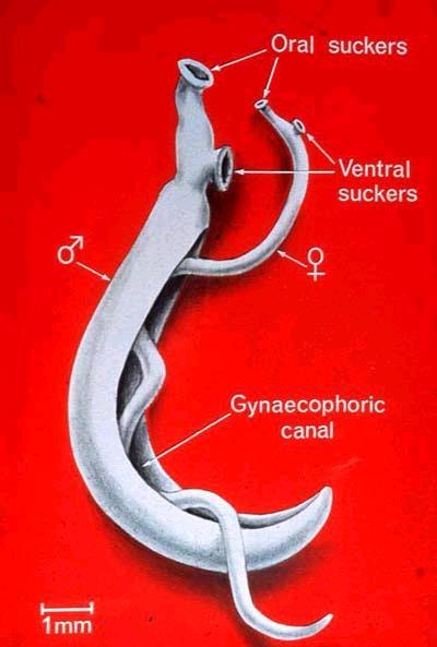吸虫纲,具有吸盘,雌雄同体的血吸虫