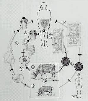 成熟节片脱落,随粪便排出;猪食入节片,经消化,节片破裂,释放数万个卵;卵孵化,幼虫穿过肠壁,经血管到达肌肉,发育成囊尾蚴;人食用未煮透的带虫猪肉,绦虫进入人体;头节钩吸附与小肠上,不断长出节片,3个月内可长到4-5米长;随粪排出的节片、卵也可直接感染人,形成囊尾蚴病。