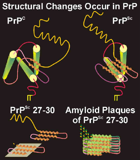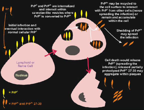 正常细胞的一个蛋白质(PrPc),位于细胞表面,参与铜离子吸收。在特定情况下,PrPc发生结构变化,成为PrPSc,PrPSc能将PrPc转化为PrPSc,PrPSc能凝聚成纤维状沉淀,纤维状沉淀造成神经细胞凋亡。