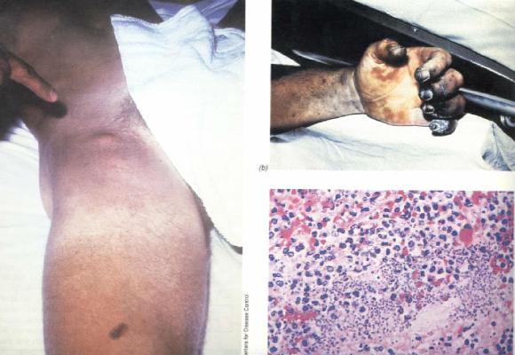 造成淋巴结肿胀,巨痛,全身布满肿块,最后血管破裂,不进行适当治疗时,死亡率达75%