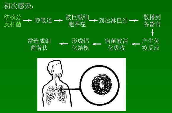 由结核分支杆菌引起,通过空气传播;染病组织、器官中形成钙化的结核,可全身感染,多感染肺部--肺结核。