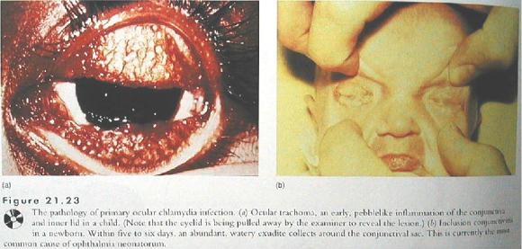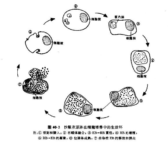 寄生在眼结膜上皮细胞内;毒素引起上皮细胞增生、坏死、脱落; 毒素向邻近细胞及皮下组织渗透,引起炎症、毛细管扩张; 引起细胞免疫性迟发性变态反应; 6小时:结膜充血、粘液脓性分泌物; 12小时:结膜水肿,重度充血;淋巴细胞聚集,形成局部隆起的滤泡,坏死后形成斑痕;不及时治疗,慢性病症可持续十数年,并可引起睑内翻等,常会危及视力。