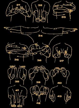 依循上式,双掌向内回收(使上臂和前臂屈曲成90度角),左手在上,右手在下,掌心向地,左掌在右肘上,右掌置於左肘下。