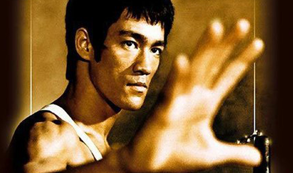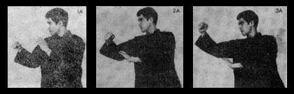 对付右手在前的对手,如下图所示:李小龙用右手抵住对手的手臂,并用前脚踩住对手的前脚以防其起脚,随后迅速交换两手位置,用左手擒住对手的手臂,向前跨步的同时,用右拳翻背猛击对手头部。请注意,李小龙在运用翻背拳时,用左手将对手拉向自己,并对其发出半圆弧的攻击,这样可增强对其的打击力度。