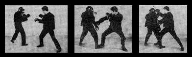 翻背拳是突发性最大的打法之一,因为它迅速、准确而且又神出鬼没,所以不易被对手察觉。这种打法由警戒式,或两手轻松地垂于两髋侧,若无其事时地发出。尤其是后一种情况,因处于非交战状态,因此可打对手一个措手不及。前手应在不泄露意图的情况下直接使用翻背拳,拳头应当自上而下地动作,翻背拳可以打击面部的任何部位,其中太阳穴是最理想的目标。如下图,从警戒式开始,做前手翻背拳(做一个垂直半圆形的运动),将身体重心前移,同时后手稍向下移,以防对手起脚或向头部及身体发出攻击,并张开后手准备格挡。