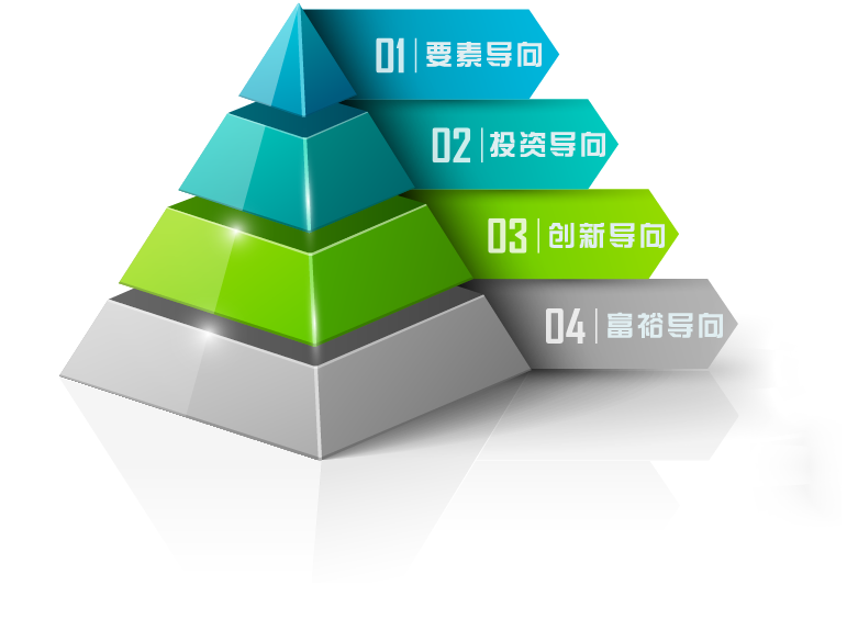 波特认为,国家经济发展可分为四个阶段,即生产要素导向阶段、投资导向阶段、创新导向阶段和富裕导向阶段,其中前三个阶段是国家竞争优势发展的主要力量,通常会带来经济上的繁荣,第四个阶段则是经济上的转折点,有可能因此而走下坡。