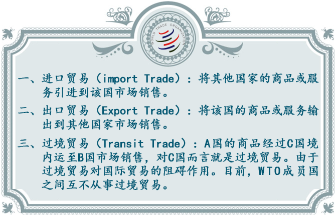 进口贸易和出口贸易是就每笔交易的双方而言,对于卖方而言,就是出口贸易,对于买方而言,就是进口贸易。此外输入该国的商品再输出时,成为复出口;输出国外的商品在输入该国时,称为复进口。