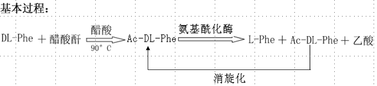 原理:DL-Phe与醋酸酐反应生成Ac-DL-Phe,氨基酰化酶可专一性水解Ac-L-Phe的酰氨键生成L-Phe,而不水解Ac-D-Phe酰氨键,再利用L-Phe与Ac-D-Phe在水中的溶解度的差异进行分离,Ac-D-Phe又可经消旋生成Ac-DL-Phe,再进行水解和分离。如此反复进行,可将DL-Phe全部转化为L-Phe。