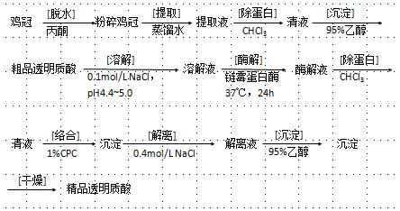 将鸡冠碎片加入到丙酮中,浸泡过夜至鸡冠脱水变硬。然后置于瓷盘中进行干燥,干燥后经粉碎机粉碎成粉状。