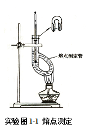 如实验图1-1装好仪器。温度计插在缺口的软木塞中,水银球位于测定管的两侧管之间,传热液液面略高于测定管的侧管口,附在温度计下端的毛细管中的样品,位于温度计水银球侧面中部(见实验图1-2)。加热时酒精灯在熔点测定管的侧管末端缓缓加热,受热的液体因温度差而发生对流循环,使温度均匀。