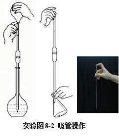 吸取溶液时,右手拿移液管,使吸管下端深入溶液液面下约1厘米处,切不可太深或太浅(为什么?)。左手拿洗耳球并将球内空气压出,将球的尖端深入移液管顶口,慢慢松开洗耳球,使溶液吸入管内,当液面在吸管标线以上时,迅速用右手食指紧按管口,将吸管尖嘴离开液面,靠在容器壁上,稍微放松食指,液体慢慢流出,待其液面下降至与标线相切时,立即按紧食指,液体停止流出。将移液管移入准备承接溶液的容器中(容器应略倾斜,移液管保持垂直),使管尖与容器内壁接触,松开食指使溶液自然下流,全部流完静待15秒钟左右,取出移液管(尖端残留液体不能吹出,如果移液管上有“吹”字,则必须用洗耳球将尖端残留液体吹入容器内)。