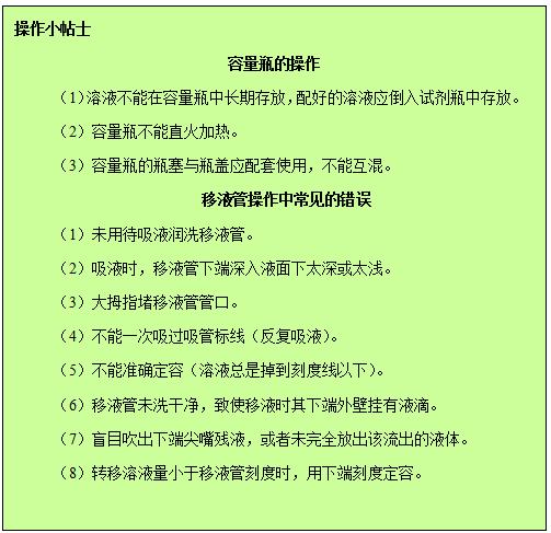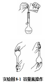 先将称好的固体物质放入干净的烧杯中用少量蒸馏水溶解。其次,将杯中的溶液沿玻璃棒小心地转移到容量瓶中,再从洗瓶中挤出少量水淋洗烧杯和玻璃棒2~3次,并将每次的淋洗液注入容量瓶中。然后加蒸馏水至标线处(加水操作要小心,切勿超过标线)。塞好瓶塞,倒转容量瓶多次,并在倒转时加以摇动(待气泡上升至底部,再倒转过来,使气泡上升到顶部,如此反复),使溶液充分混合均匀。如用浓溶液配制稀溶液,一般先用少量蒸馏水在烧杯中稀释,再转移至容量瓶中,最后配成一定体积的稀溶液。