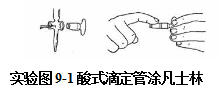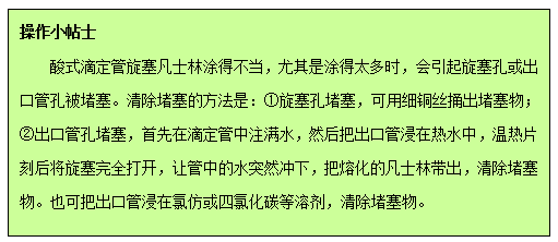取出旋塞,洗净,擦干,在塞子大小两端各涂少许凡士林,然后,将旋塞对准旋塞槽中央一直插入槽内,插时旋塞应与旋塞槽平行,以免涂在旋塞上的凡士林扎堆粘在旋塞槽某处。接着,向同一方向旋转旋塞,直至活,旋塞转动部分看起来透明即可。最后用橡皮圈套住活塞末端,以防活塞脱落。