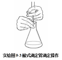 将滴定管夹在滴定管夹子上,必须保持垂直,否则读数不准。用右手持锥形瓶颈部。使用酸式滴定管时,左手的大拇指、食指和中指转动旋塞,使酸液逐滴滴入锥形瓶内,同时右手不断摇动锥形瓶,以使溶液混合均匀。使用碱式滴定管时,用左手挤压橡皮管内玻璃球使碱液逐滴滴入瓶中。