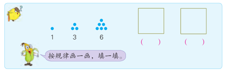 例如,根据给出的由若干个小圆点构成的图形系列,按规律接着画一画、填一填,初步体会用图形表示数量关系的方法(一上第94页思考题)。
