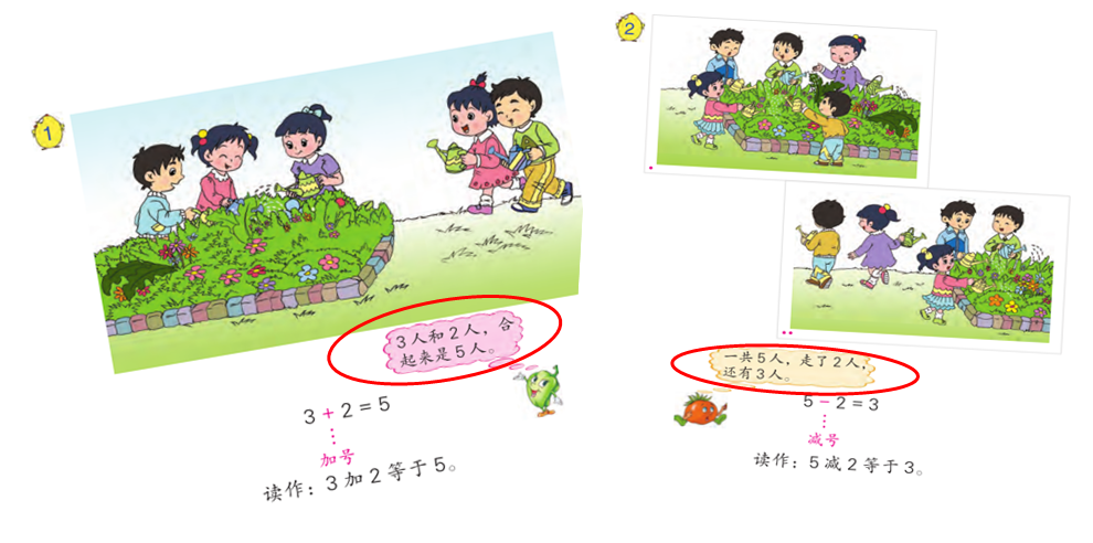 例如,教学加、减法的认识时,为引导学生在描述图意的过程中,逐步学会从加、减运算的角度提出问题,先在例1和例2中示范“3人和2人,合起来是5人”“一共有5人,走了2人,还有3人”。