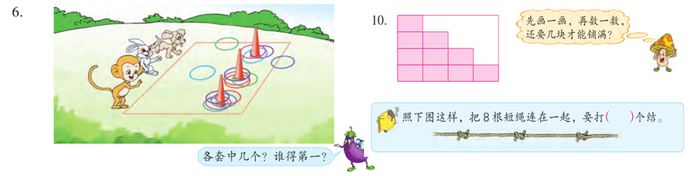 例如,教学10以内数的认识,引导学生应用比较数的大小的方法判断三个小动物的套圈比赛中,“谁得第一” ;应用“画一画、数一数”的方法,由简单到复杂推想“8根短绳连成一根长绳一共需要打几个结” 。