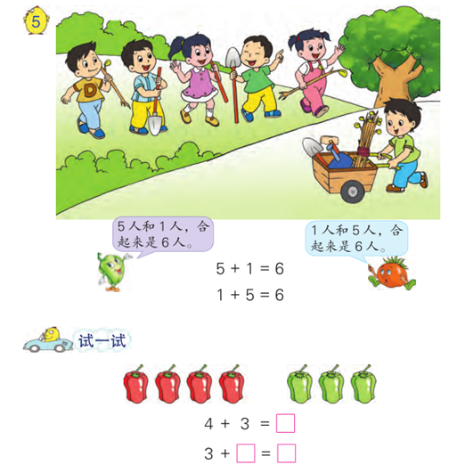 为引导学生感受相关加法算式或减法算式之间的联系,先在例5中示范“5人和1人,合起来是6人”“1人和5人,合起来是6人”。