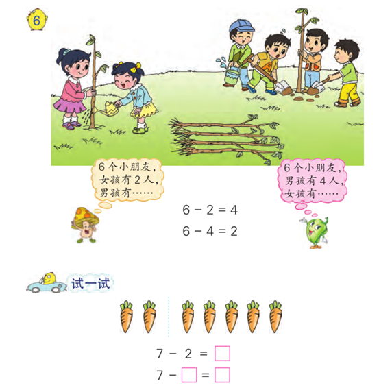 再通过例6引导学生思考“6个小朋友,女孩有2人,男孩有……”“6个小朋友,男孩有4人,女孩有……”。