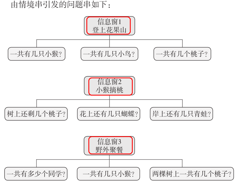 是由“登上花果山——小猴摘桃——野餐聚会——野餐结束——游水帘洞——小猴分桃——小猴跳水——小猴学钓鱼”8个信息窗组成的情境串。8个情境反映的都是花果山上的所见所闻。