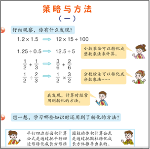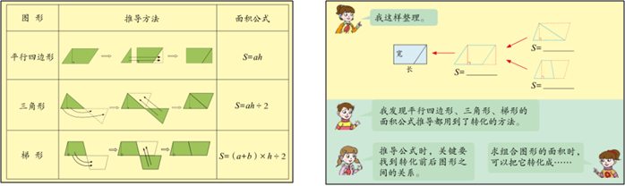 在单元的回顾整理中进行提升与强化。如五上“多边形的面积”回顾与整理中,以表格的方式对转化法进行提炼和总结。设计了这样几个问题:“我发现图形的面积公式都用到了转化的方法。”、“推导公式时,关键是找到转化前后图形之间的关系。”、“求组合图形的面积,就可以用转化成……”,这是一种显性的编排方式,单独设计学习转化的数学思想方法的内容,意在引导学生主动发现与提升。