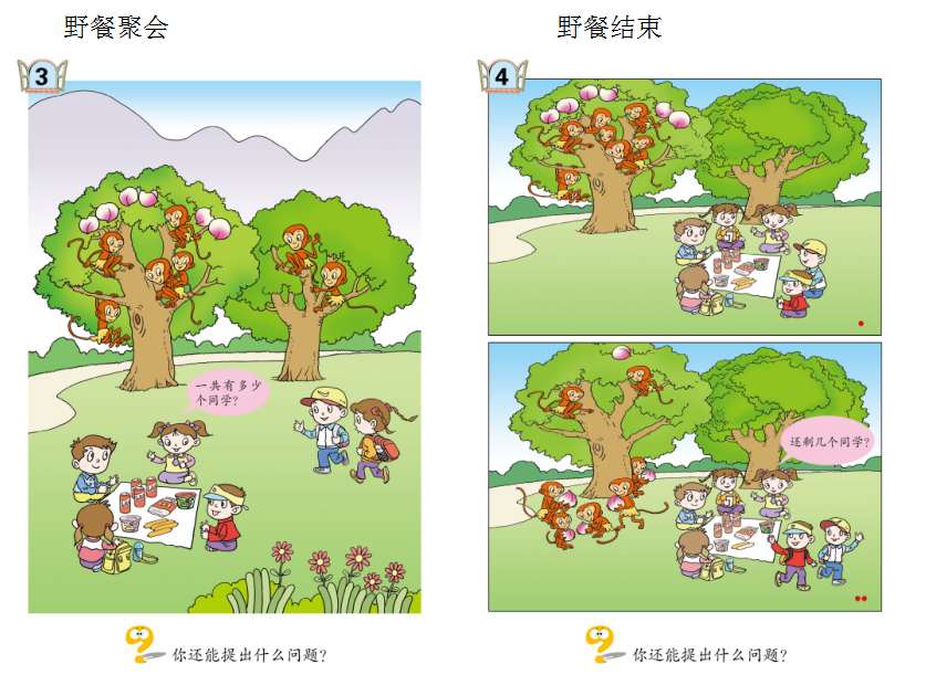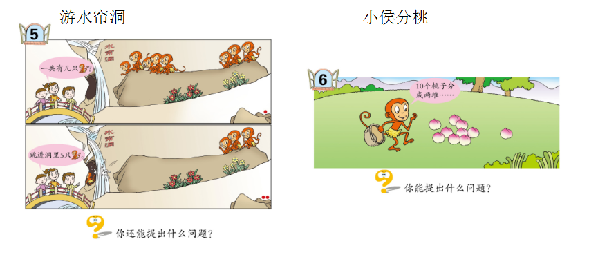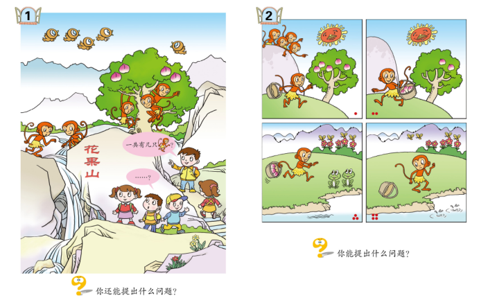 如,一年级上册第三单元“走进花果山(学习10以内数的加减法),是由登“上花果山——小猴摘桃——野菜聚会——野餐结束——小猴分桃——小猴跳水——小猴学钓鱼”8个故事组成的情境串。