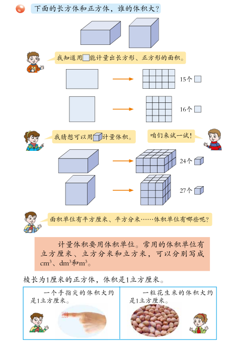 再如,五年级下册“包装盒——长方体和正方体” 单元,要测量体积大小,需要有统一的体积单位。于是,教材引导学生回顾面积单位的建立过程,通过类比,提出猜想,即借助用小正方形测量面积的方法,提出测量长方体要用小正方体作标准。然后,学生仿照面积单位的建立过程,逐步建立体积单位。在这个过程中,学生收获的不只是“体积单位”,更重要的是提高了合情推理能力,即运用已有的知识和方法,借助经验和直觉,通过归纳和类比等推测某些结果。这种编排方法在本套教材中多次应用,如由圆的面积的研究方法类推出圆柱体积的研究方法等。