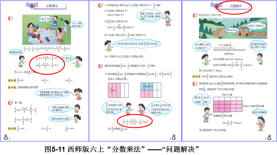 如,六上的“分数乘法”,先重点学习整数乘分数和分数乘分数的运算方法,紧接着就学习“问题解决”,也就学习用分数乘法解决简单的实际问题,突出了对解决问题能力的培养。