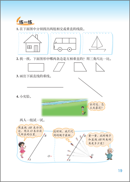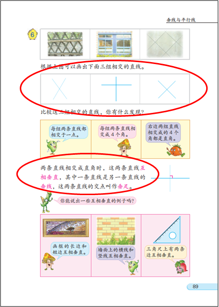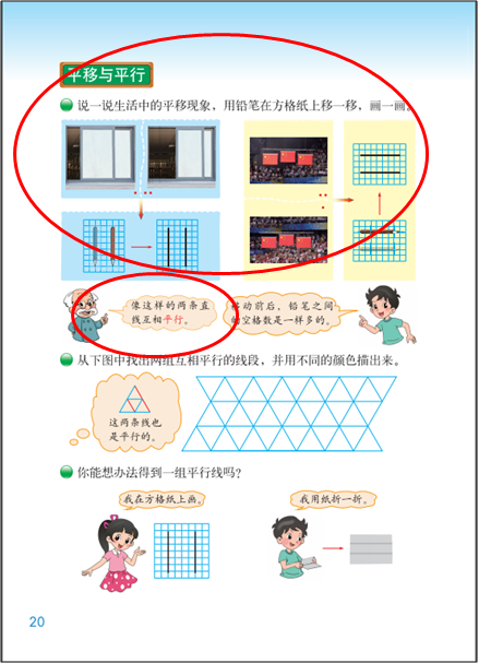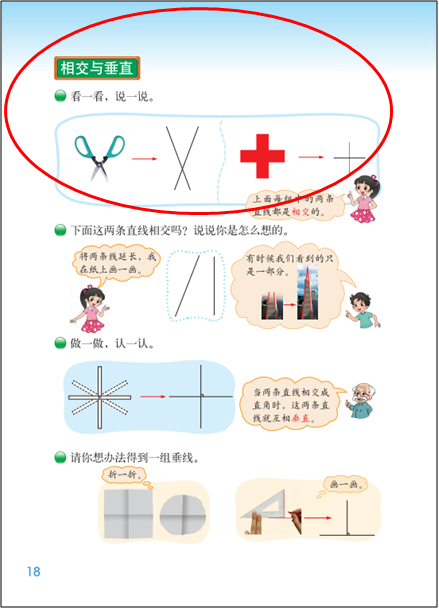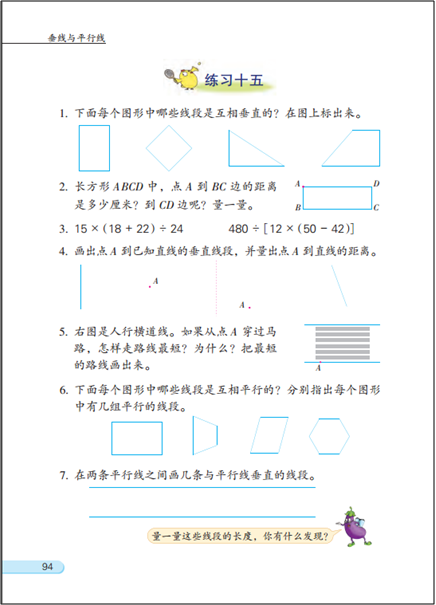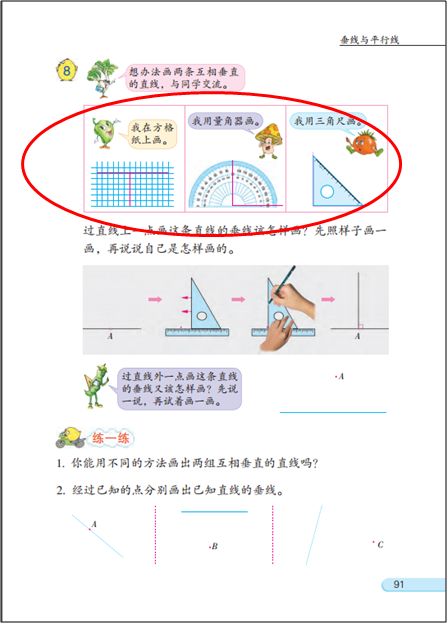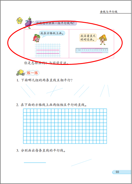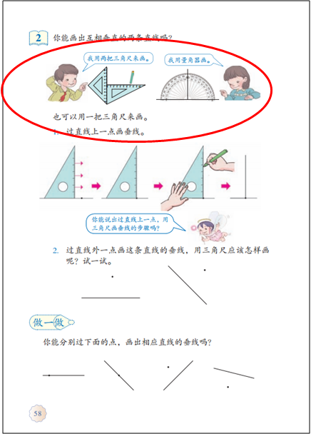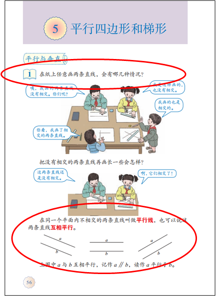 操作:一是通过实物操作或者画一画等活动,感受两条线在同一平面内的位置关系、或者被一点固定的两条线动态变化时所形成的不同相交情况等。另一个是指画“垂直、平行”。但有的教师仅仅理解成对画图技能的训练,教学中增加了画图技能要求的高度,偏离了教材编写的初衷。
