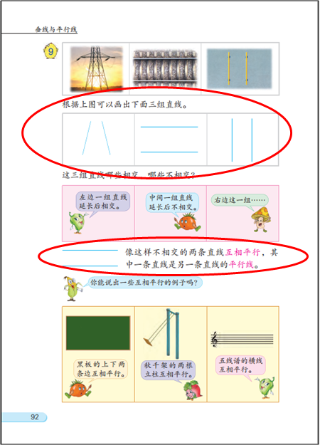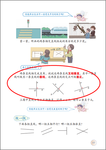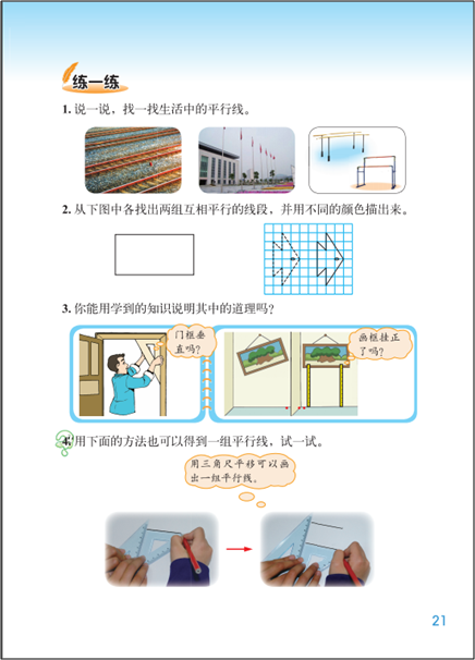 由于“线的认识”涉及到的几个概念大多是原始概念或者基本概念,是不定义的,也比较抽象,所以不仅教材中使用了一些生活中的近似例子,教学中教师也应注重引导学生感受线、垂直或平行的现象在生活中的应用,帮助学生完成从实物到几何图形的抽象,培养空间想象力。
