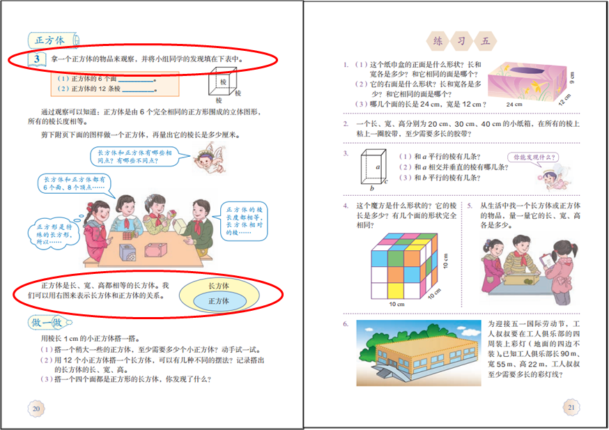 要重视对操作活动的设计,将概念在实践中具体化。教材的编写对学习方式是比较关注的,安排了观察、操作、想象、推理等多样的活动内容。在具体教学时,教师还可以补充更多的实践活动,保证学生有充足的时间和空间经历观察、实验、猜测、计算、推理、验证等历程。