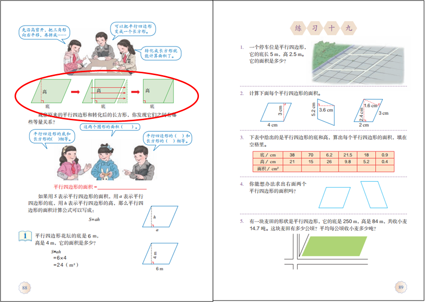 规则图形周长、面积和体积测量公式探索的过程中,蕴含着丰富的数学思想方法,能够很好地落实让学生“感悟数学的基本思想”这一课程目标。就平行四边形而言,其面积计算的学习过程中,至少涉及化归思想、出入相补原理、推理能力等方面的培养。