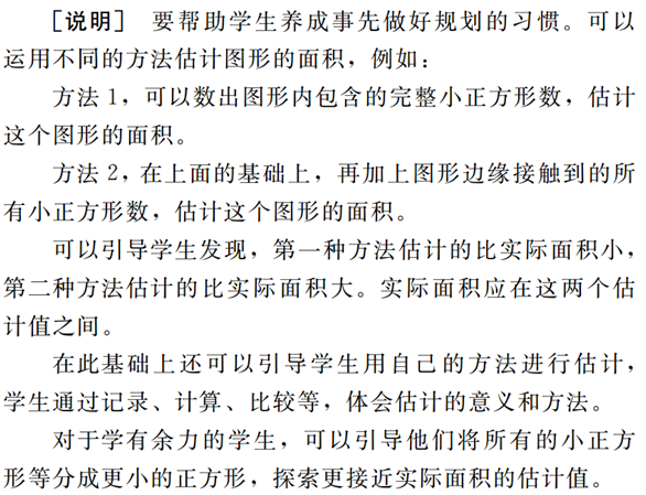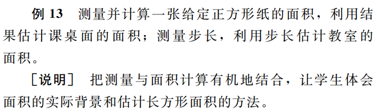 ○探索并掌握长方形、正方形的面积公式,会估计给定简单图形的面积(参见例13)。