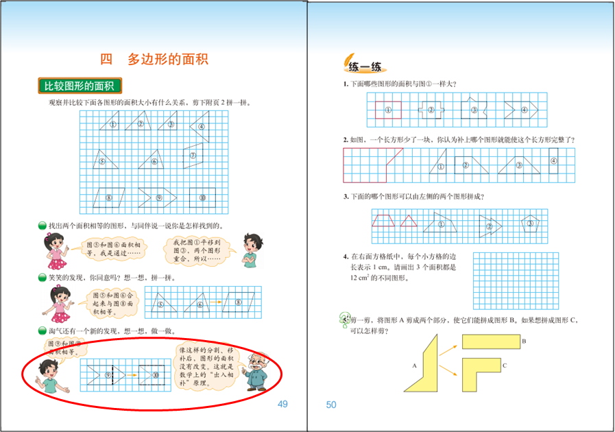 教材编写是比较重视直接测量的,编写了“在格子图中数一数”等内容,这是让学生在数一数的过程中,进一步理解测量的本质、体会面积的含义等;另外还要通过直接测量来促进对间接测量方法的理解,及对面积体积计算公式的理解。