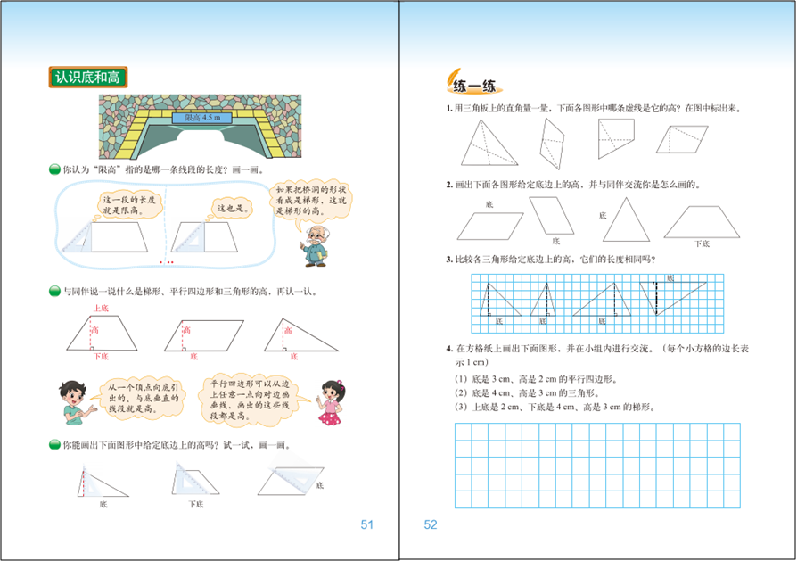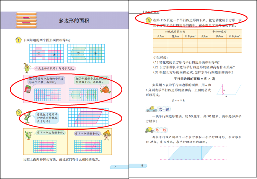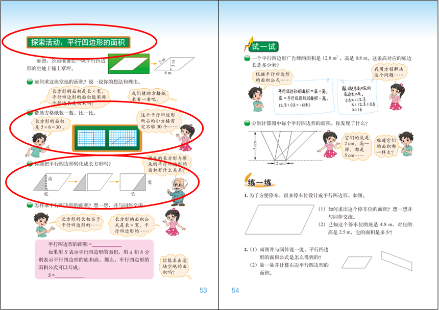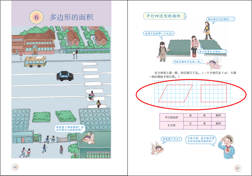 学生学习平行四边形的面积时,教师应设计一些活动,如在格子图中数面积、辨析下面图形的面积是否发生变化等,让学生进一步明确面积及面积单位的含义 。