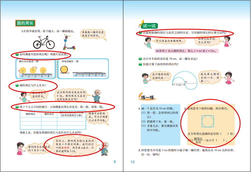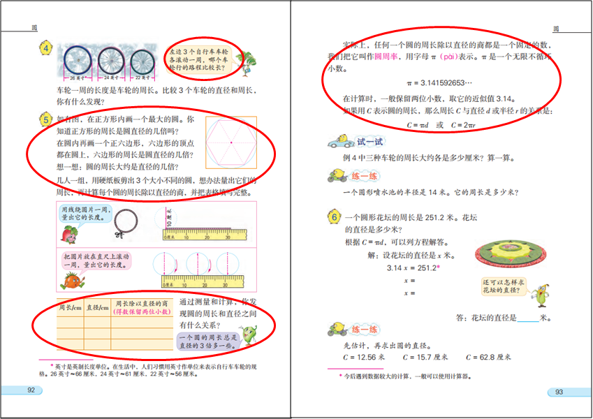 过去教材往往会给出圆的周长的含义,目前的教材基本上把这个含义用实物来替代——车轮滚动一圈行的路程就是车轮的周长;有的教材甚至都没有类似的描述,这就给学生真正理解圆的周长概念带来的困难。教师可以借助“绕线法”“滚动法”来帮助学生突破这一难点,尤其是绕线法,都直接源自圆的周长的概念,通过化曲为直、动手操作让学生体会和理解圆的周长的含义。