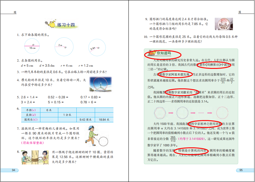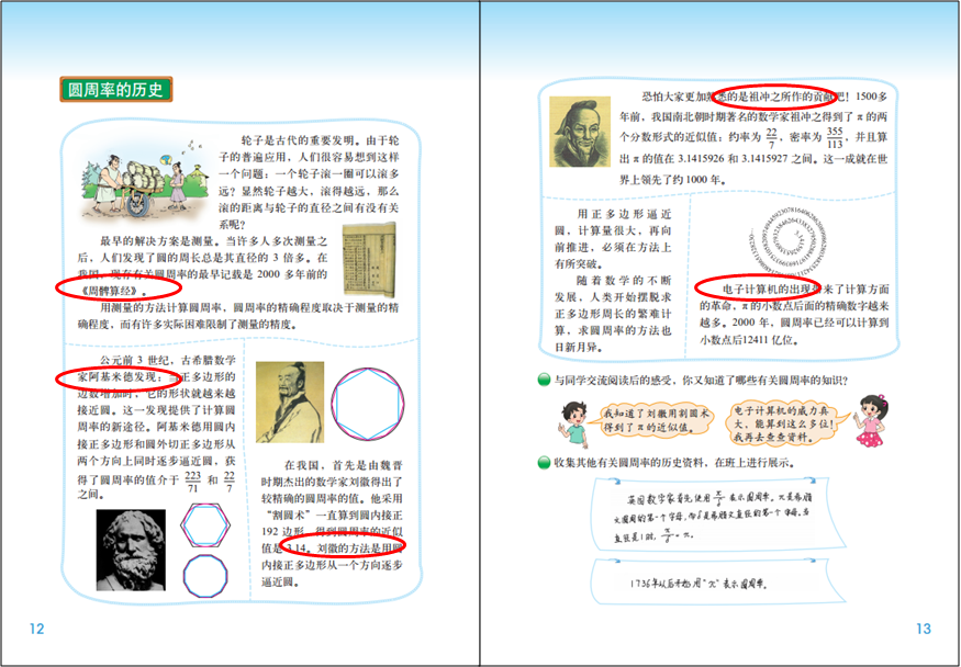 圆周率的研究历史悠久,其探索的历史蕴含了历代数学家对真理的孜孜不倦和严谨求实的态度。教师教学中要充分地利用这些数学史的内容,一方面作为补充的资料扩展学生的阅读,一方面作为学生探索圆周率的路径供学生选择和比较。