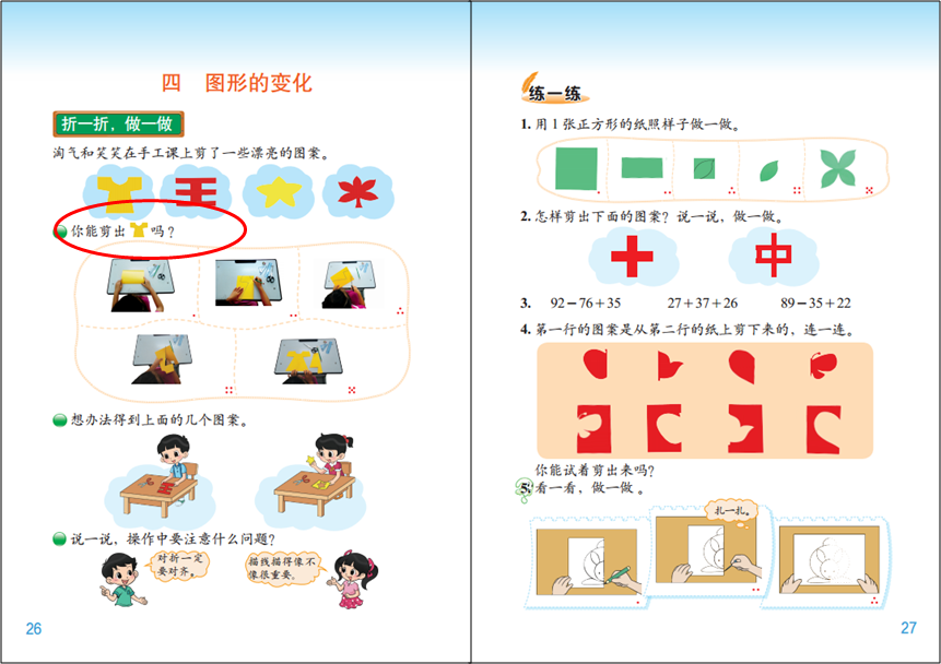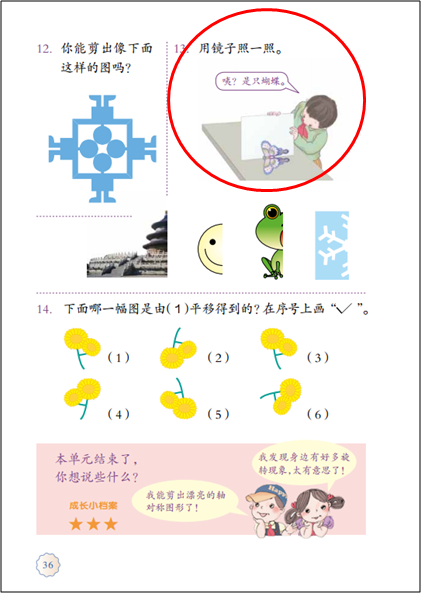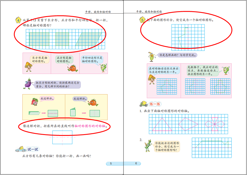 ○通过观察、操作等活动,进一步认识轴对称图形及其对称轴,能在方格纸上画出轴对称图形的对称轴;能在方格纸上补全一个简单的轴对称图形。